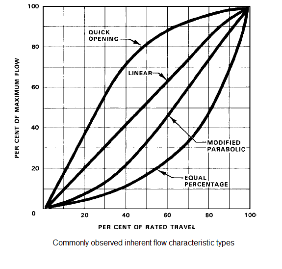 控制阀开度(也称为“阀行程”)与通过阀的流量之间的关系称为该阀的流量特性。固有的流量特性是在恒压条件下阀门开度和流量之间的关系。有4种主要类型的控制阀特性,有时也被称为“控制阀阀内件”。装饰和特征术语可以互换使用。