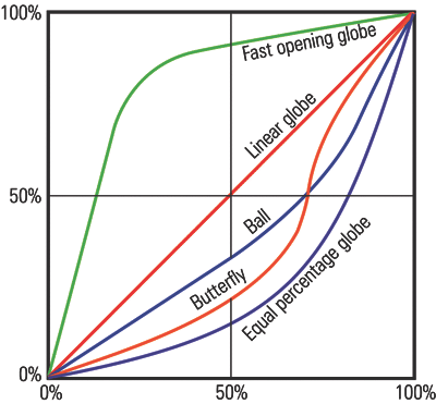 - 的线性流动特性具有恒定的斜率,这意味着这种类型的阀门在整个流量范围内具有恒定的增益。这些阀门通常用于液位控制和某些需要恒定增益的流量控制操作。