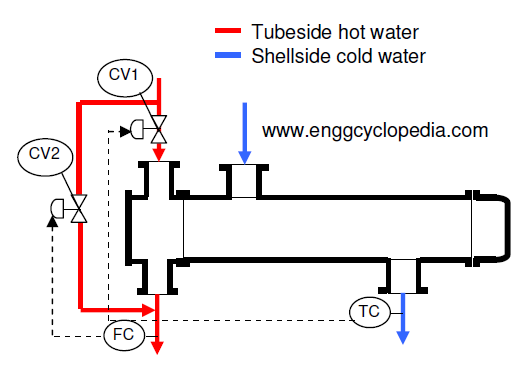 - 在换热器的热水侧(管侧),热水出口总流量的温度可以通过使用控制阀(在换热器原理图中为CV2)调节旁通管道流量来控制。在目前的布置中,主要考虑对热水总流量的流量控制。由于通过换热器tuside的热水比例已经被控制,用于壳侧出口温度控制,通过旁路的热水比例被调整,以保持换热器出口侧的热水总流量相同。在这种情况下,组合流的温度无法控制。