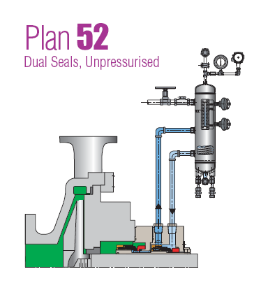 方案52使用外部储液器,为非增压双密封装置的外部密封提供缓冲液。储液器中的冷却盘管可用于从缓冲流体中去除热量。
