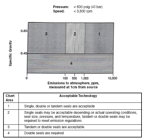 决定用double机械密封而不是单一的机械密封是不容易的。许多因素都会影响这一决定。然而,一般来说,大多数处理比重值较低(如0.4或更低)且必须符合挥发性有机化合物(VOC)排放法规的泵都可能配备双(双)型机械密封.下表可以作为一个粗略的指导方针。在任何情况下,用户都必须咨询泵和机械密封制造商,然后才能得出最终结论。