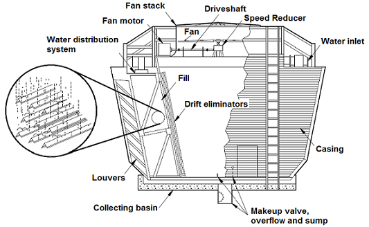 强制通风冷却塔与诱导通风冷却塔非常相似。基本的区别是,在强制通风冷却塔中,空气从冷却塔的底部吹出。由于水分配问题和再循环困难,它们的使用受到限制。