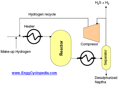 石脑油加氢处理装置的目的是去除硫和氮化合物石脑油加氢处理装置使用钴钼催化剂,通过将硫转化为硫化氢(与未反应的氢一起被去除)来去除硫。一些硫化氢-氢混合物通过压缩机再循环回反应器以利用未反应的氢。