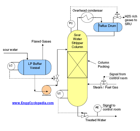 缓冲容器的酸水被送到水平控制下的酸水剥离柱。如果到列的流量看到可能经常干扰柱操作的主要波动,则柱入口水管路上的流量控制阀可以与来自缓冲容器电平控制的级联信号一起使用。如果它们富含H,则可以向缓冲容器闪蒸的气体闪烁或送到硫磺回收单元2S.