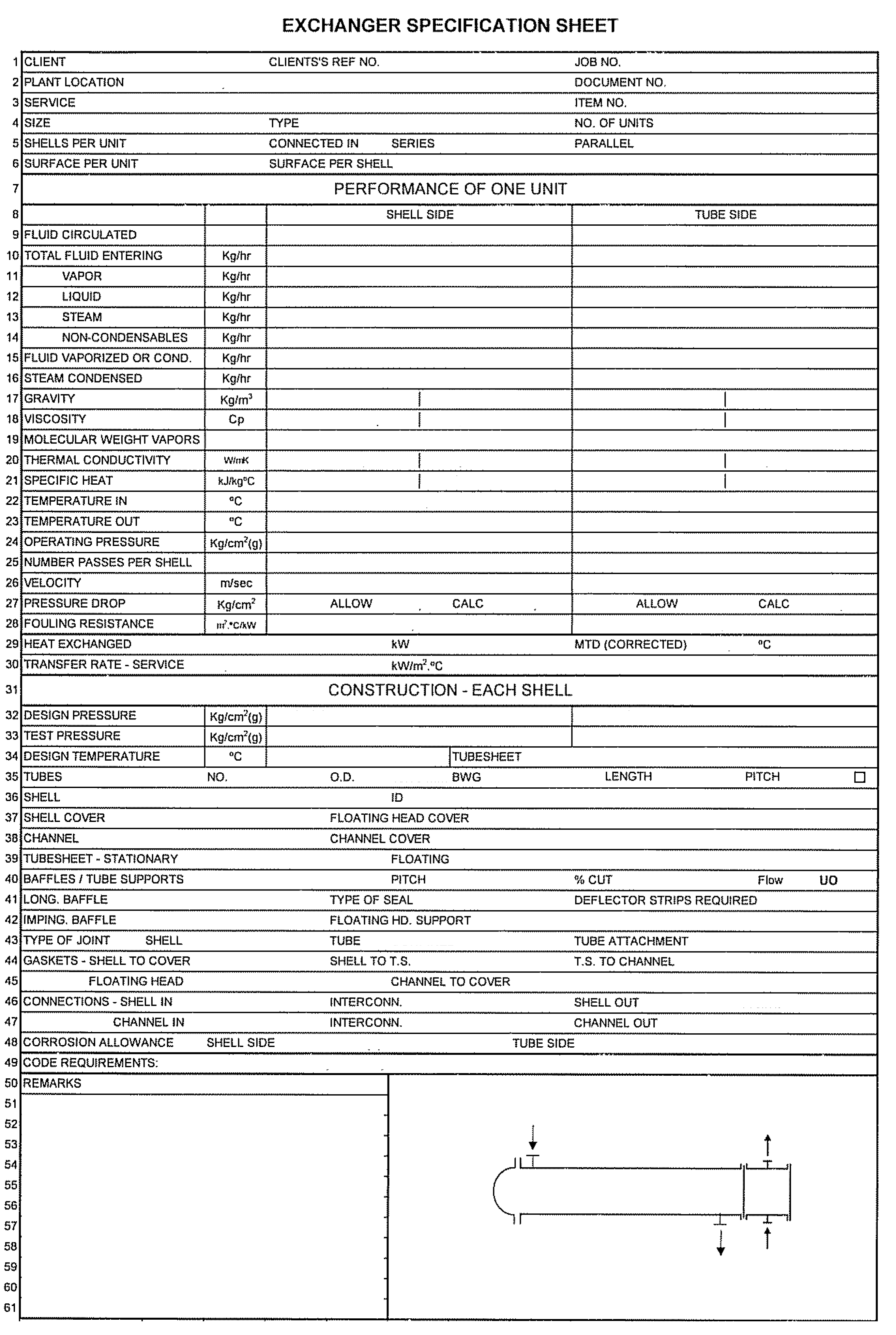 订货时为制造一管壳式换热器,客户应向制造商提供该管壳式换热器的规格表。一份典型的换热器规格书内容如下: