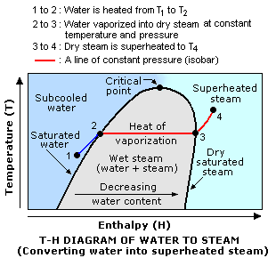 - 当所有的水都被煮沸(点3)时,在干蒸汽旁边加的热量被用来将其温度提高到沸点以上。增加蒸汽温度的额外热量是蒸汽的“过热”。蒸汽超过沸点的超额温度是-“过热度”。