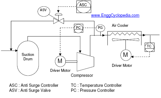 离心式压缩机系统的典型PFD- 离心式压缩机系统中包含的常用设备是压缩机,驱动器电机或涡轮机,吸入鼓(kod)从进入压缩机和后冷却器的气体中除去痕量的液体,这有助于降低来自压缩机的放电气体的温度。抗浪涌控制器以及抗喘振阀的一部分是该系统的一部分,以避免在浪涌条件下操作压缩机。