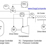 Centrifugal compressor systems- Typical centrifugal compressor system with a compressor, driver motor/turbine, compressor suction knock out drum, compressor aftercooler, antisurge valves etc.