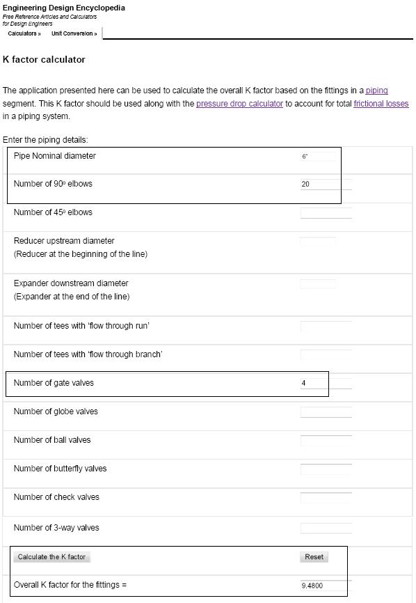 解决管线尺寸问题的最后一步是计算考虑管线连接件和弯头的管线总压降。ld乐动体育appEnggCyclopedia的K因子计算器可用于此目的。