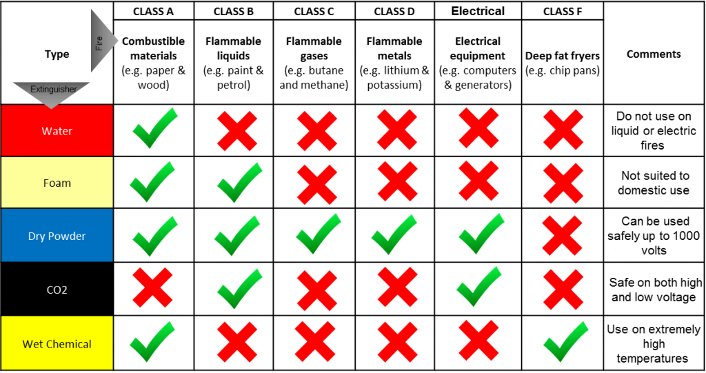 火灾的类型也是一个强有力的决定因素,应该使用哪种类型的灭火器来扑灭火灾。下面的火灾分类表解释了不同类型的灭火器,用于扑灭不同类型的火灾。