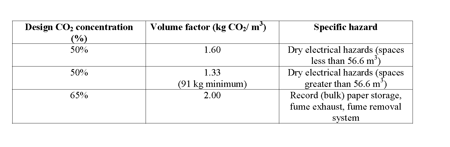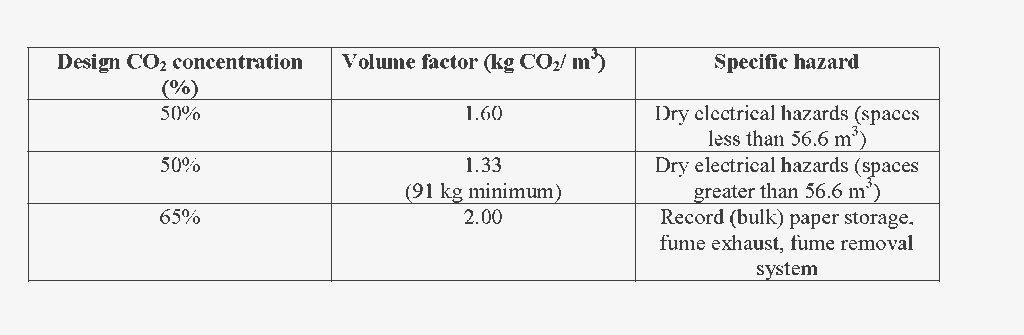 一旦知道净体积,我们就着手确定所涉及的可燃材料类型所需的二氧化碳的设计浓度。在任何情况下,不得使用低于34%的浓度。设计浓度通常是通过在NFPA 12表5.3.2.2中所示的最低浓度因子中加入20%的安全系数来计算的,即设计浓度= 1,2 *最低浓度