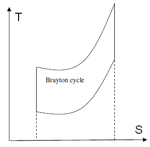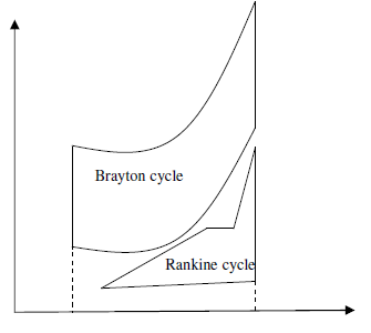 布莱顿循环和联合循环电厂的T-S图如图所示,循环所围合的面积与循环中上线以下面积之比称为总面积效率.开式循环燃气轮机的效率约为43%。由于兰金循环低于布雷顿循环,联合循环的效率约为60%。