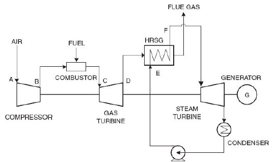 - 产生的蒸汽(F)驱动汽轮机,汽轮机排出的废气供给冷凝器。凝结水再次被泵回HRSG。