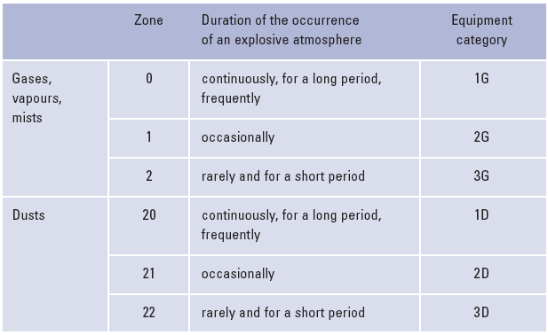 下表提出了根据相关类别的区域和设备分配的概述(G是气体,蒸气和雾的缩写,而D是灰尘的缩写)