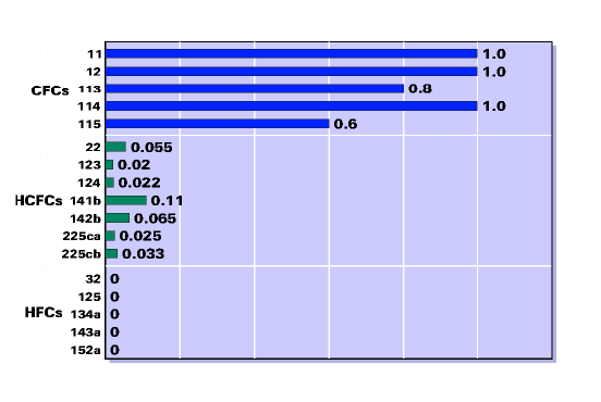 一般来说,所有制冷剂类型的特点是两个数字:臭氧损耗的潜力(ODP)和全球变暖潜力(GWP)。
