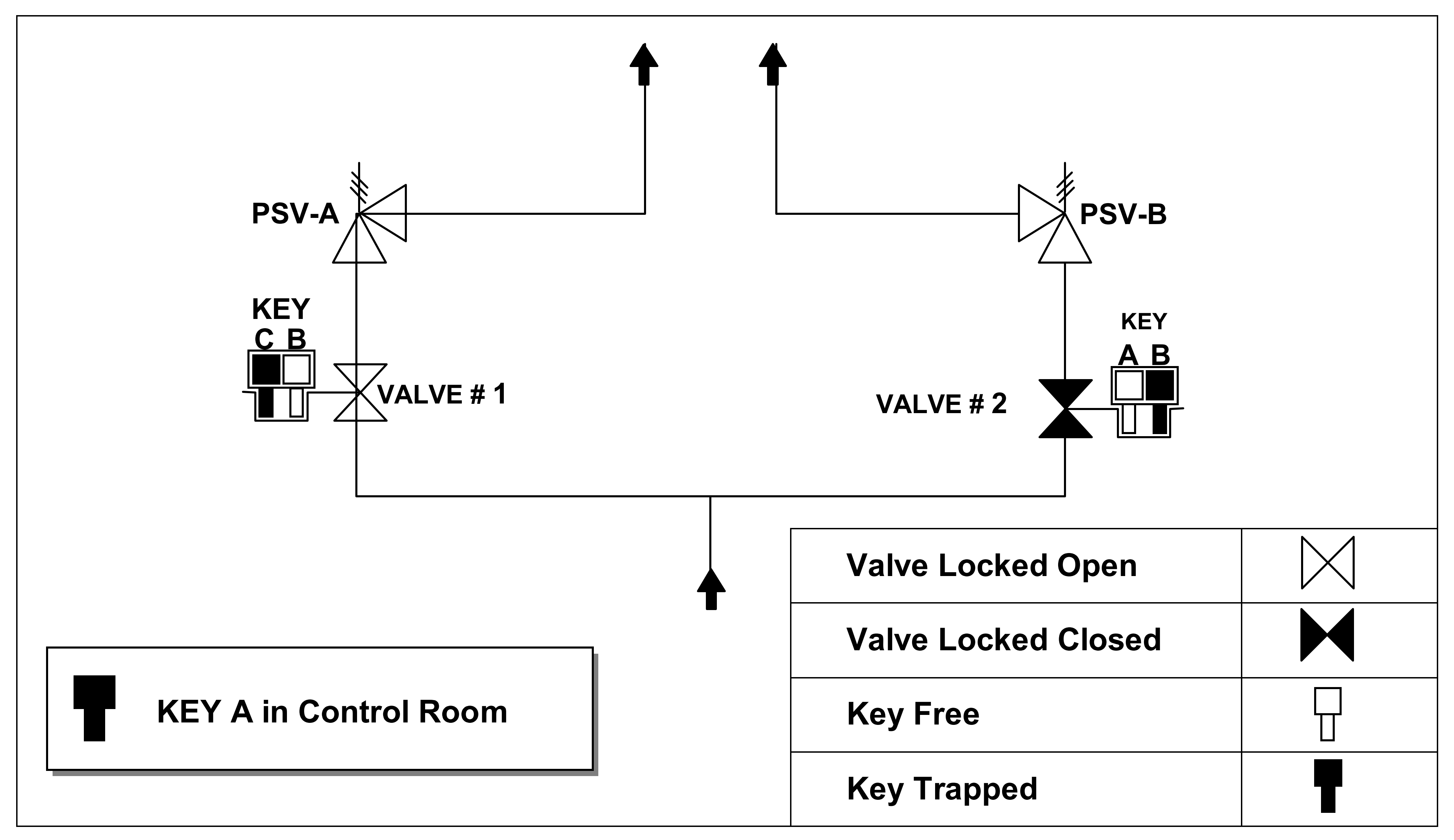 一般情况下,该系统的工作原理是:当阀门锁紧关闭时,一个键自由,当阀门锁紧打开时,另一个键自由。下面是一个典型的案例,说明了阀门联锁系统及其操作顺序。