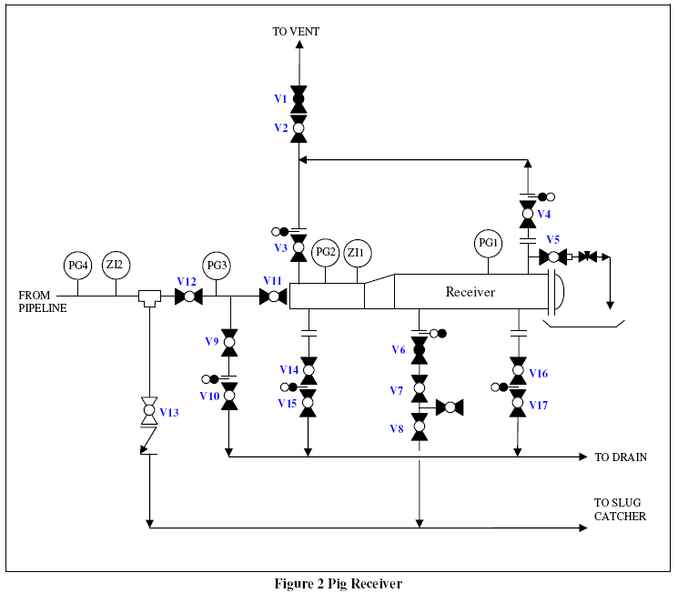 - Once pressure gauges PG1 and PG2 are showing that the receiver is completely depressurized, open drain valves V9, V10, V14, V15, V16 and V17 to drain any liquid from the launcher (and pipe spool between receiver valves) to the drain system.