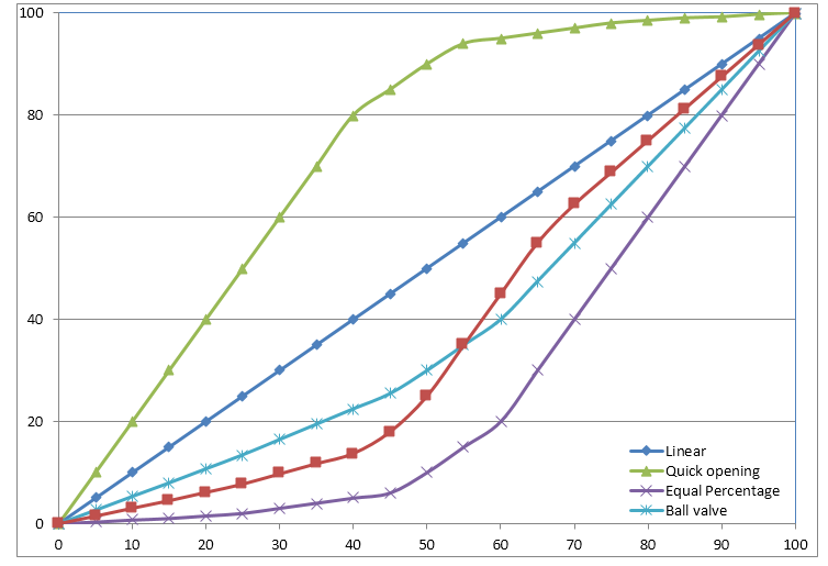 - 线性 - 这种类型的控制阀通常是全球阀,这是线性行为,流量随阀门开口线性增加。