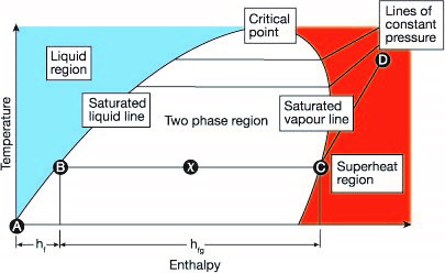 锅炉操作使用来自燃料源的化学能将能量输送到锅炉水。在锅炉内部,液体从燃烧过程中获得能量,并转变状态为饱和蒸汽。水在A点进入锅炉,水获得显能(hf)到B点,状态的变化参考图1中的B点。随着饱和蒸汽从锅炉燃烧过程中获得更多的能量,蒸汽达到了较高的质量(从左向右移动),用点B到点C表示。从点C到点D蒸汽获得的能量增加,流向蒸汽的过热度。