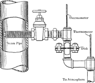 图5显示了节流量热计的典型形式。蒸汽通过取样短节从垂直主管道中抽出。然后它绕过第一温度计杯,通过两个法兰之间圆盘上的⅛“孔,绕过第二温度计杯,进入大气。