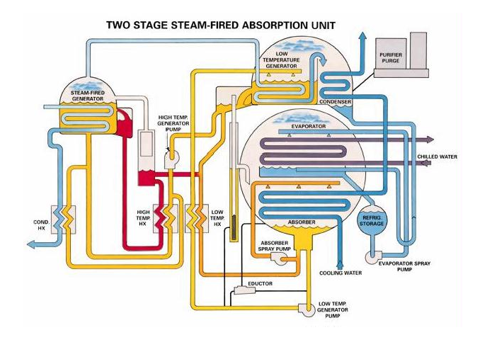 吸收式制冷系统或吸收式制冷机—吸收式冷水机利用过程工厂的余热生产冷冻水。通常使用纯水作为制冷剂,而溴化锂(LiBr)溶液作为吸收剂。吸收式制冷循环的一般步骤有:制冷剂蒸发、溴化锂吸收制冷剂蒸汽、利用余热再生溴化锂溶液、冷凝蒸气等。