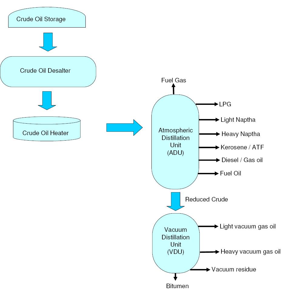在脱盐之后,原油通过与蒸馏产品、内部循环流和塔底液体进行热量交换,进一步加热。最后,燃料炉(加热炉)将原油流加热到约400°C的温度,并送入常压蒸馏装置(ADU)或原油蒸馏装置(CDU)的底部。